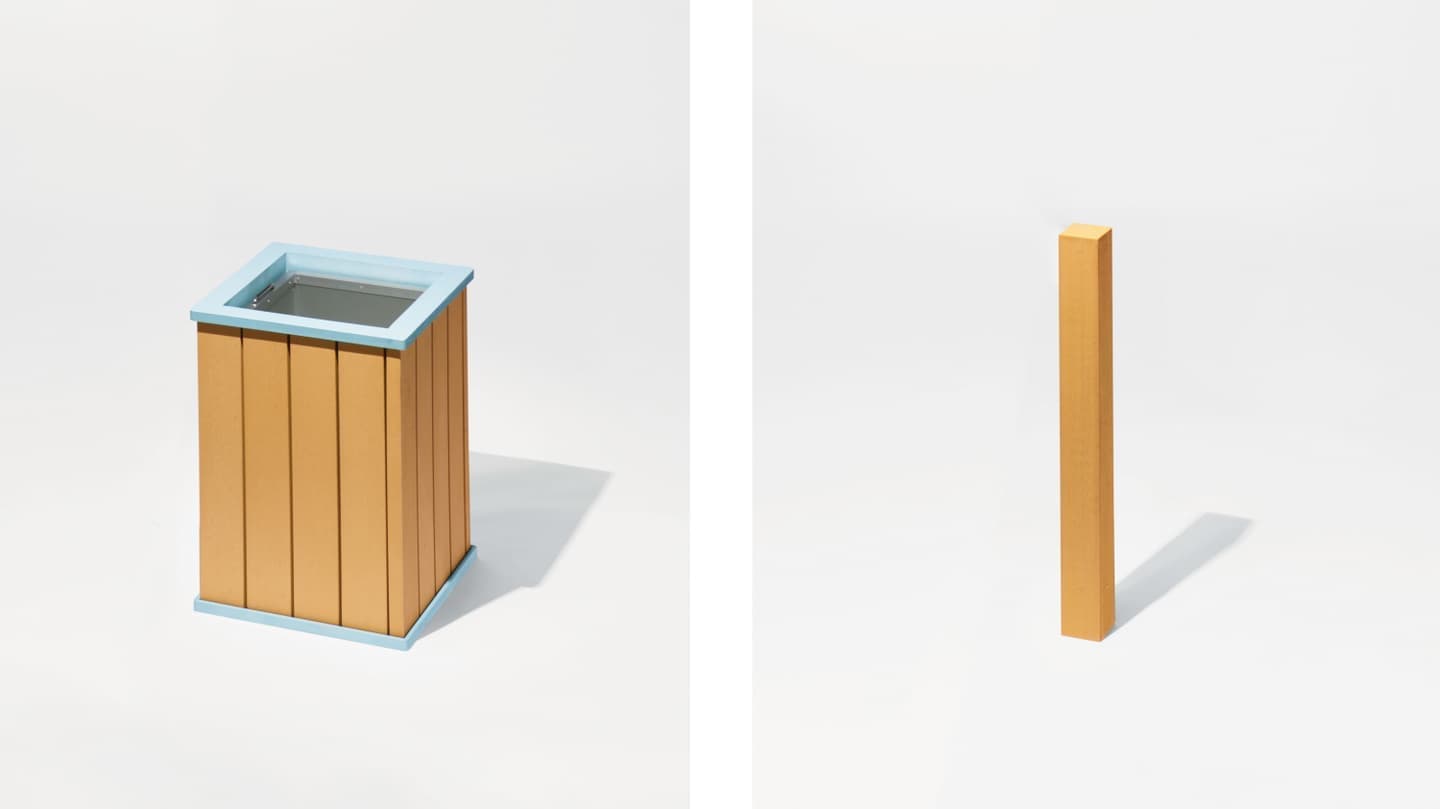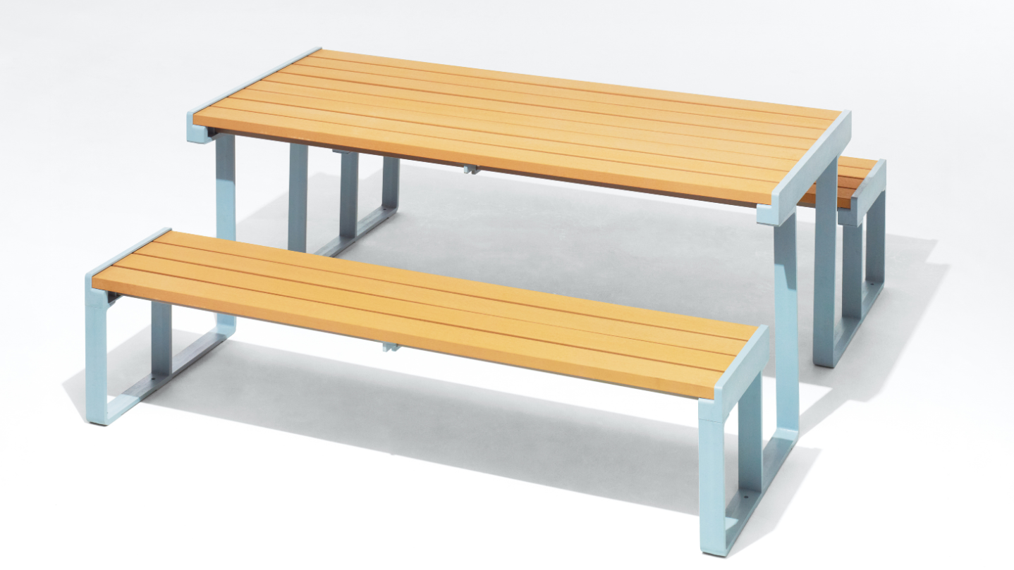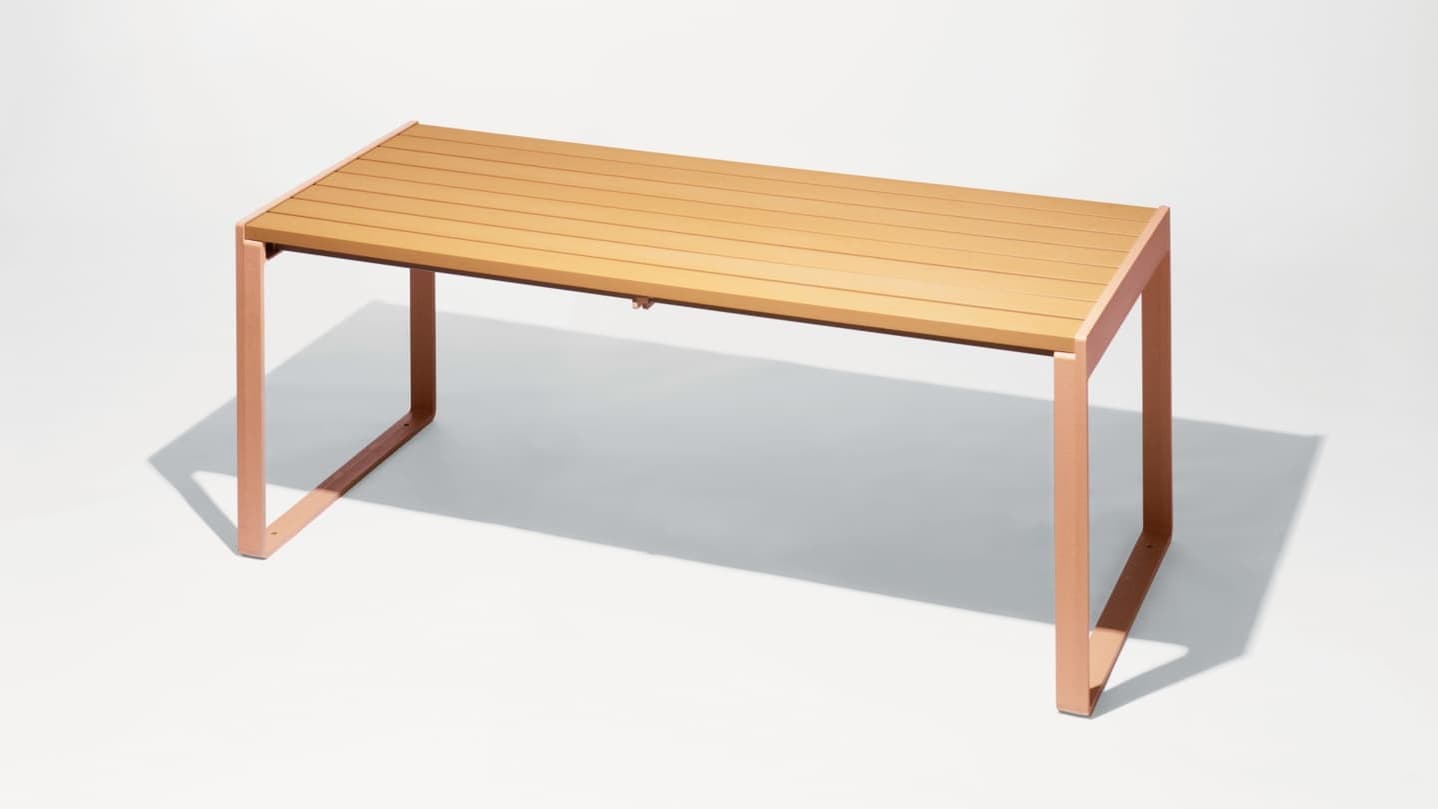 再生木材と、スマートなアルミフレームによるシンプルで機能的な構造は、設置された環境の中で違和感なく調和します。また、見た目に反して屋外家具としての充分な耐久性も備わっており、質実剛健と呼ぶにふさわしいプロダクトです。