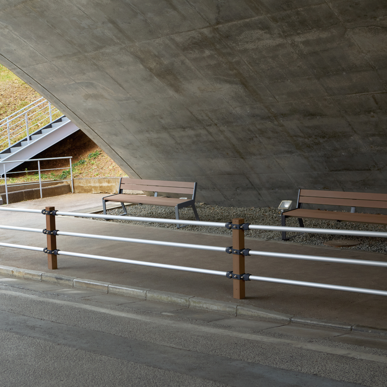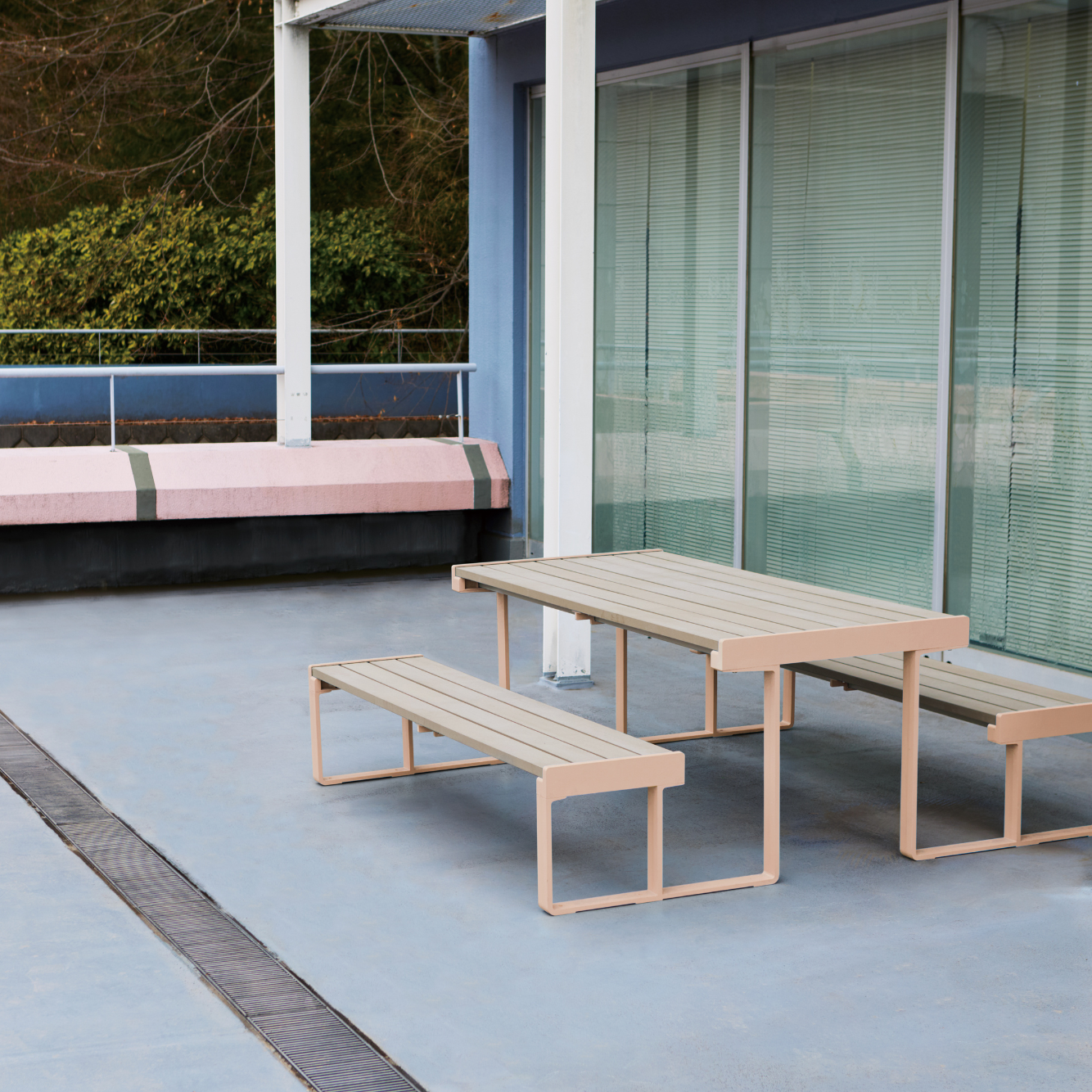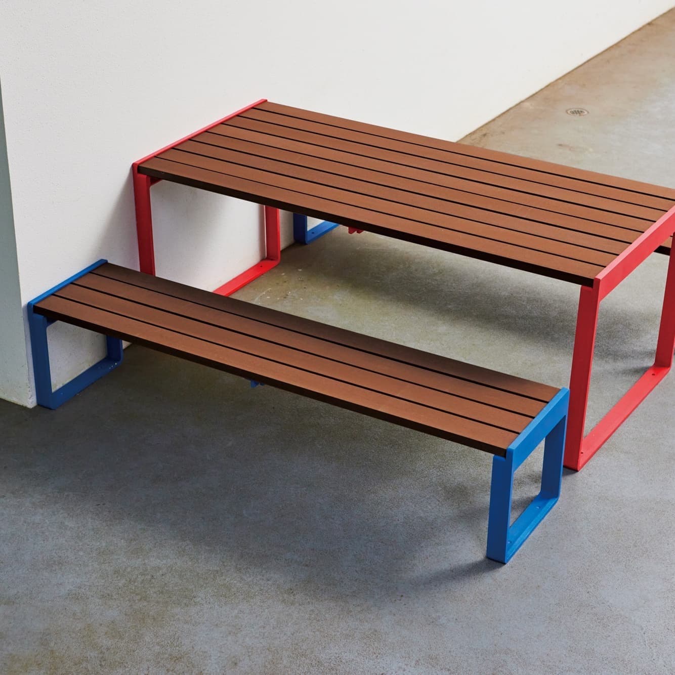 再生木材と、スマートなアルミフレームによるシンプルで機能的な構造は、設置された環境の中で違和感なく調和します。また、見た目に反して屋外家具としての充分な耐久性も備わっており、質実剛健と呼ぶにふさわしいプロダクトです。