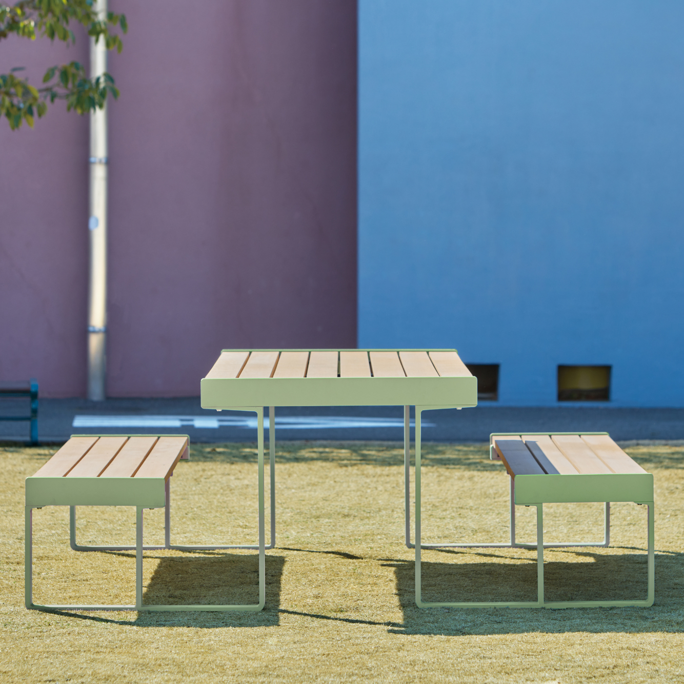 ノイラウムの製品は全て、過剰な装飾を排除し、機能性を突き詰めたデザインで設計されています。3色の再生木材と9色のアルミニウム製フレームの組み合わせによって、まちを豊かに彩ります。