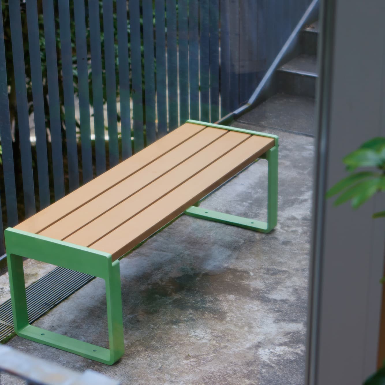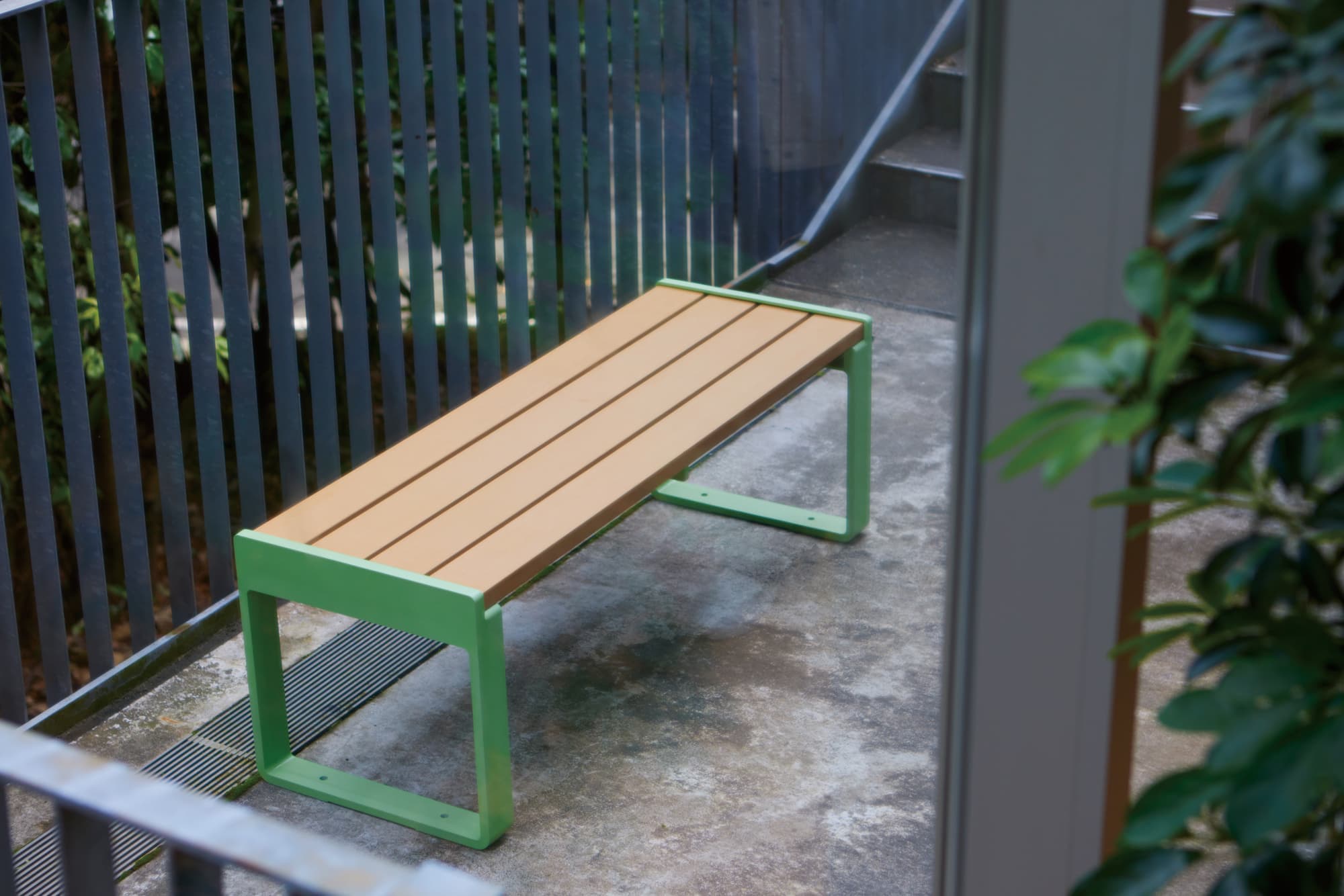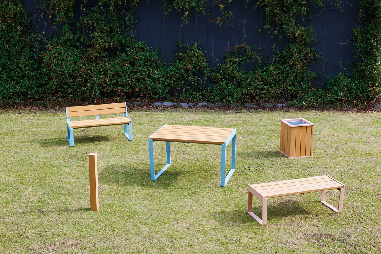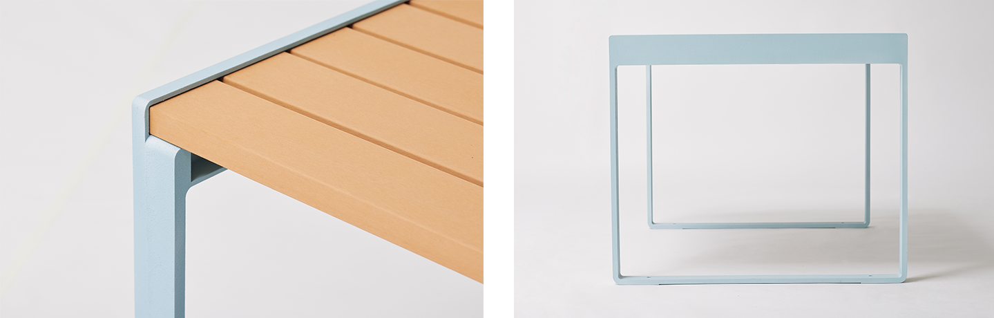 再生木材と、スマートなアルミフレームによるシンプルで機能的な構造は、設置された環境の中で違和感なく調和します。また、見た目に反して屋外家具としての充分な耐久性も備わっており、質実剛健と呼ぶにふさわしいプロダクトです。