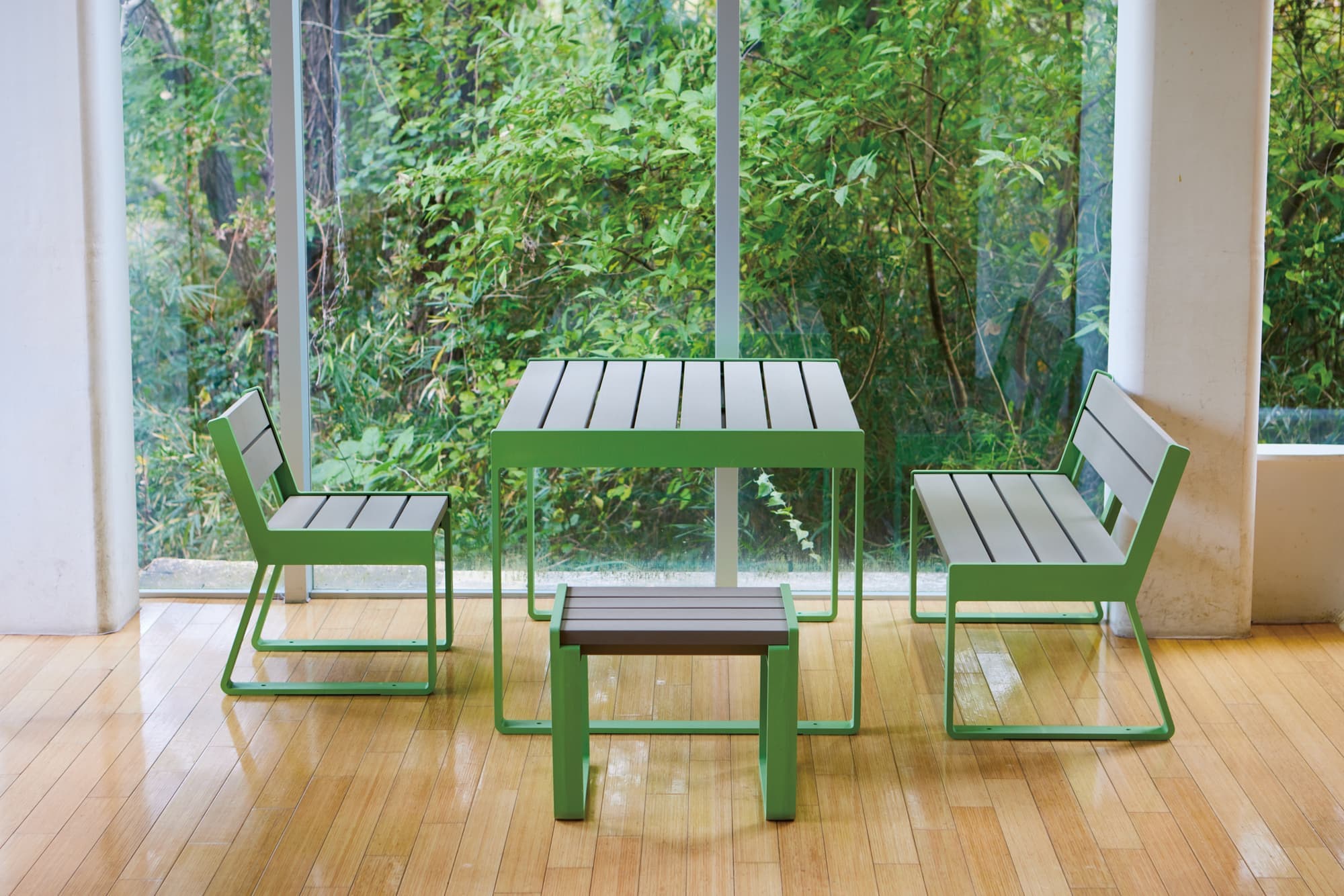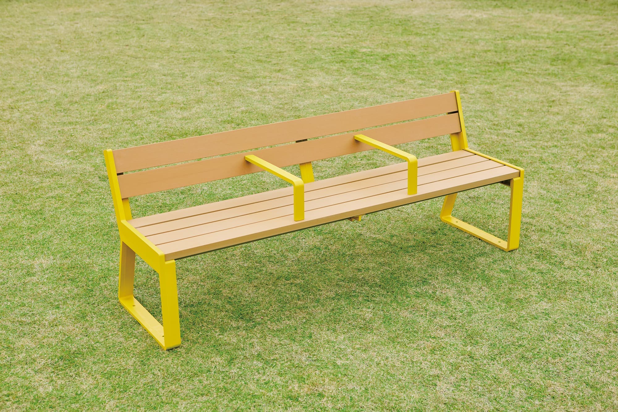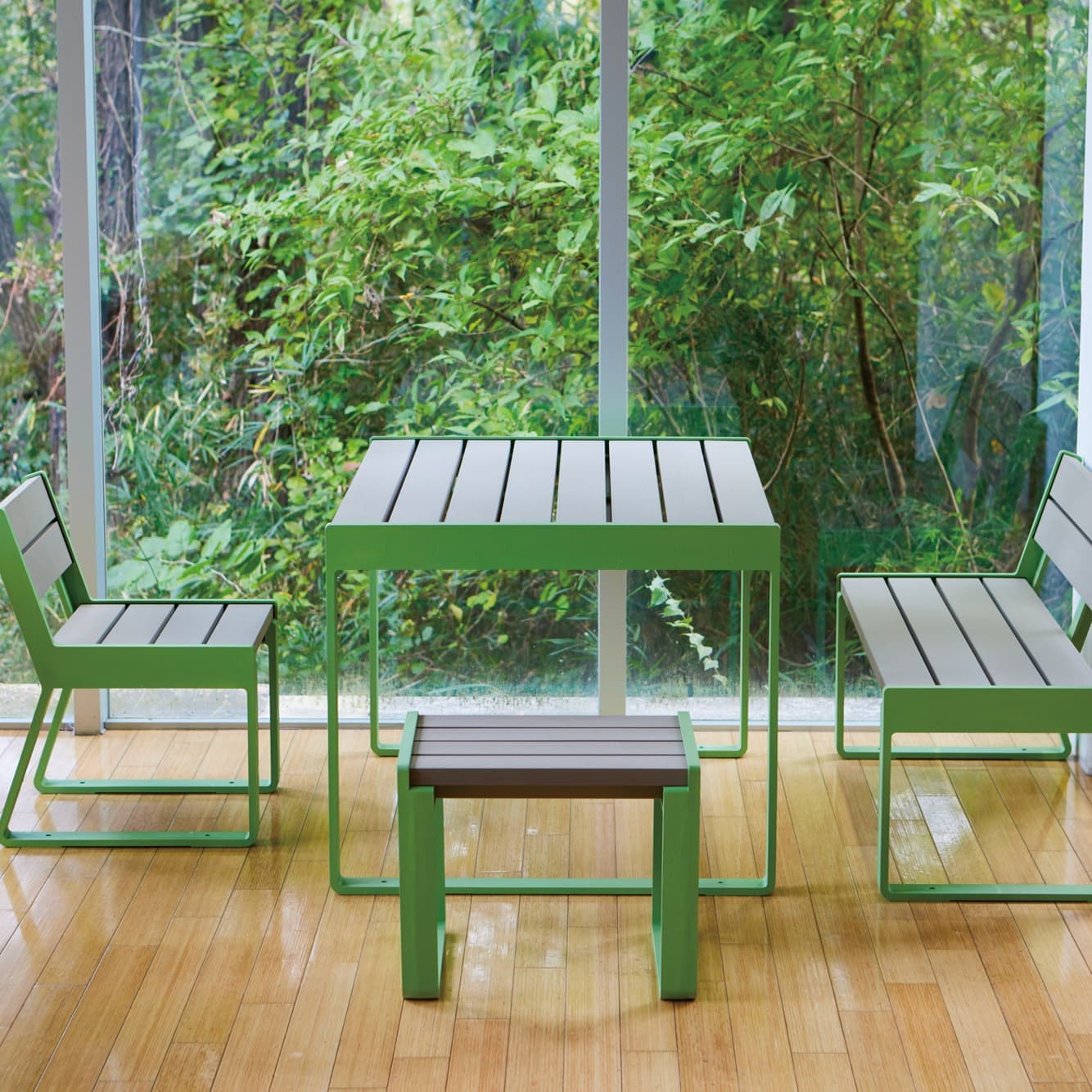 再生木材と、スマートなアルミフレームによるシンプルで機能的な構造は、設置された環境の中で違和感なく調和します。また、見た目に反して屋外家具としての充分な耐久性も備わっており、質実剛健と呼ぶにふさわしいプロダクトです。