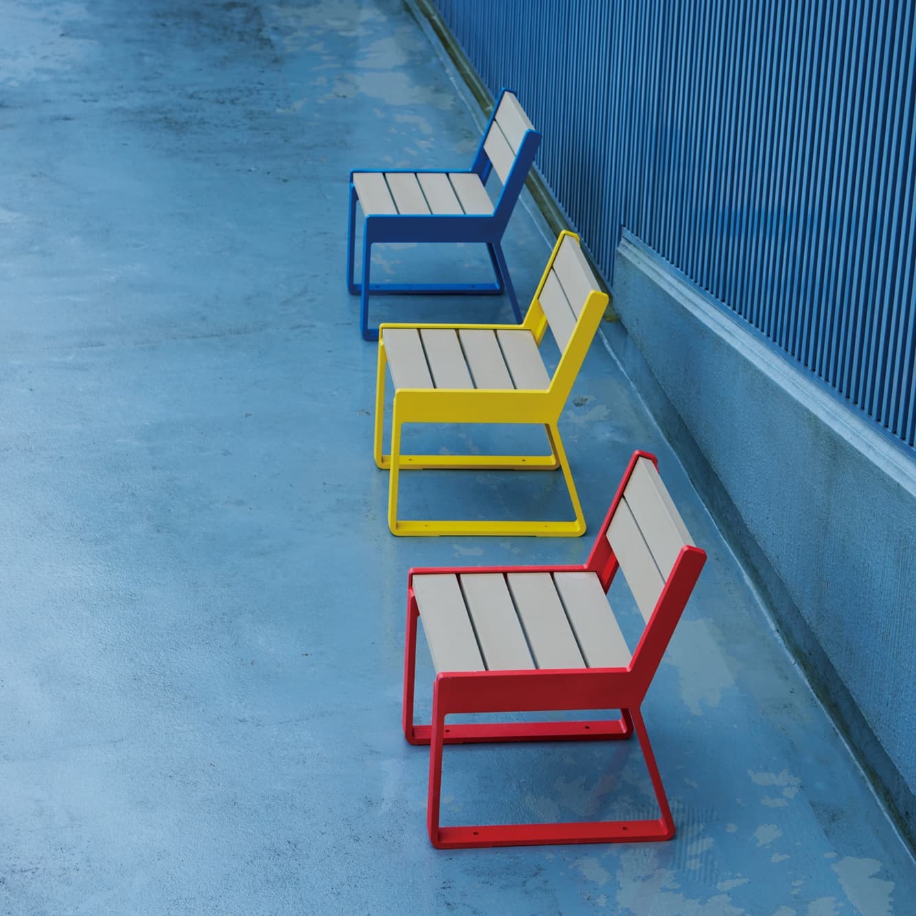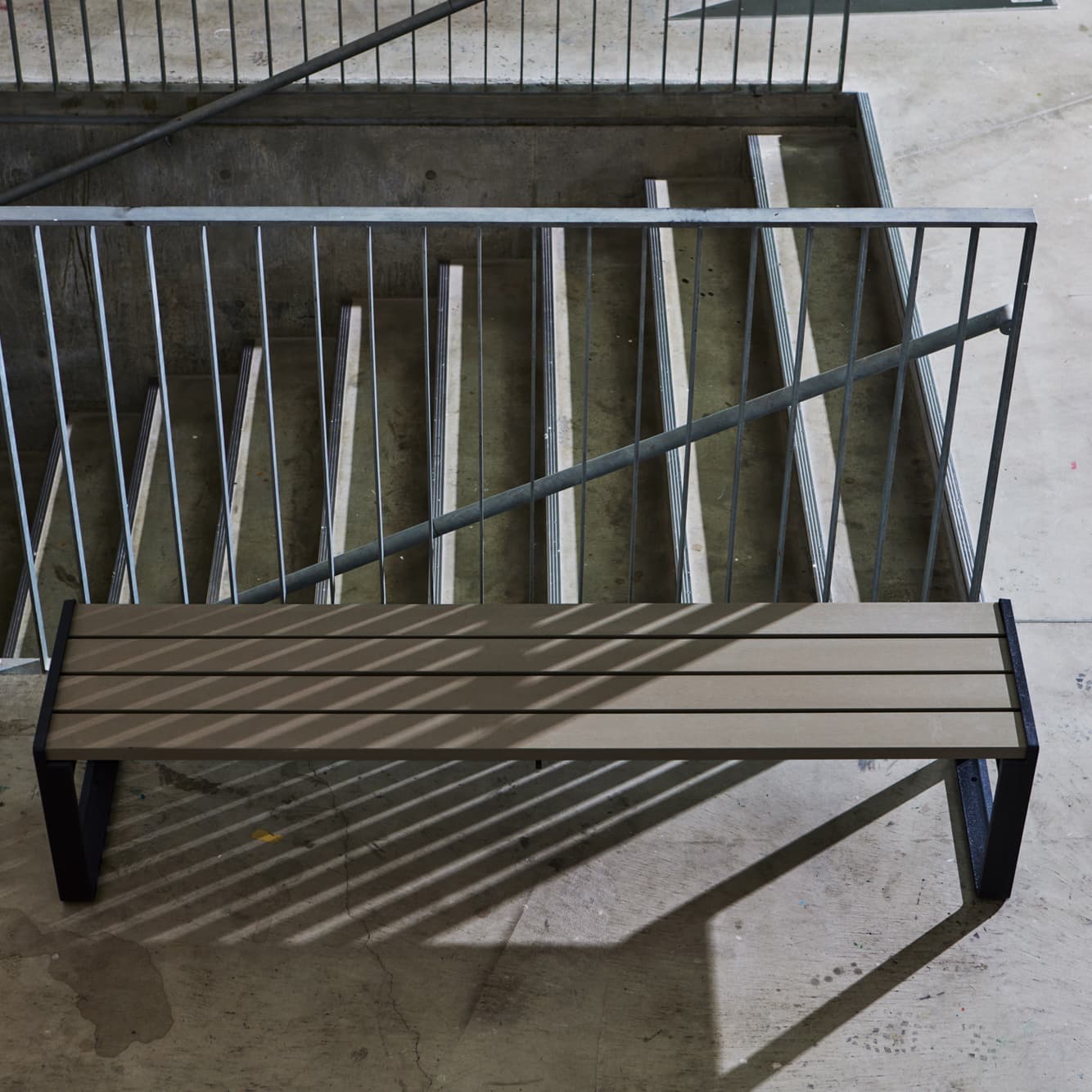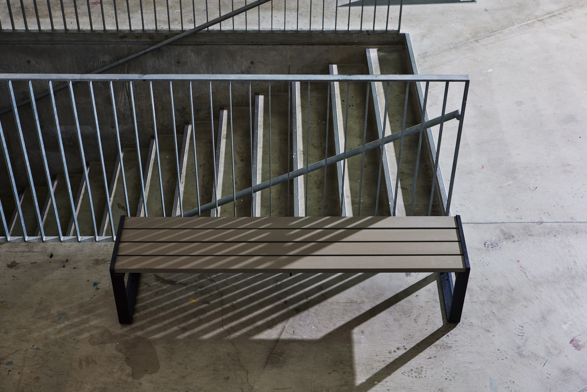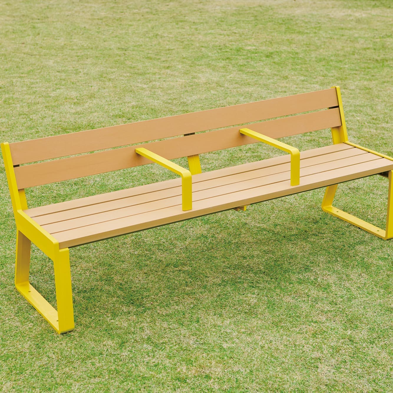 再生木材と、スマートなアルミフレームによるシンプルで機能的な構造は、設置された環境の中で違和感なく調和します。また、見た目に反して屋外家具としての充分な耐久性も備わっており、質実剛健と呼ぶにふさわしいプロダクトです。