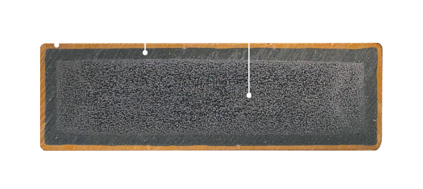 「プラスッドM」は中身の詰まった中実・無垢形状の再生木材です。表層・中間層・コア層の3層の断面構成で衝撃に強く、割れにくいという特徴があります。