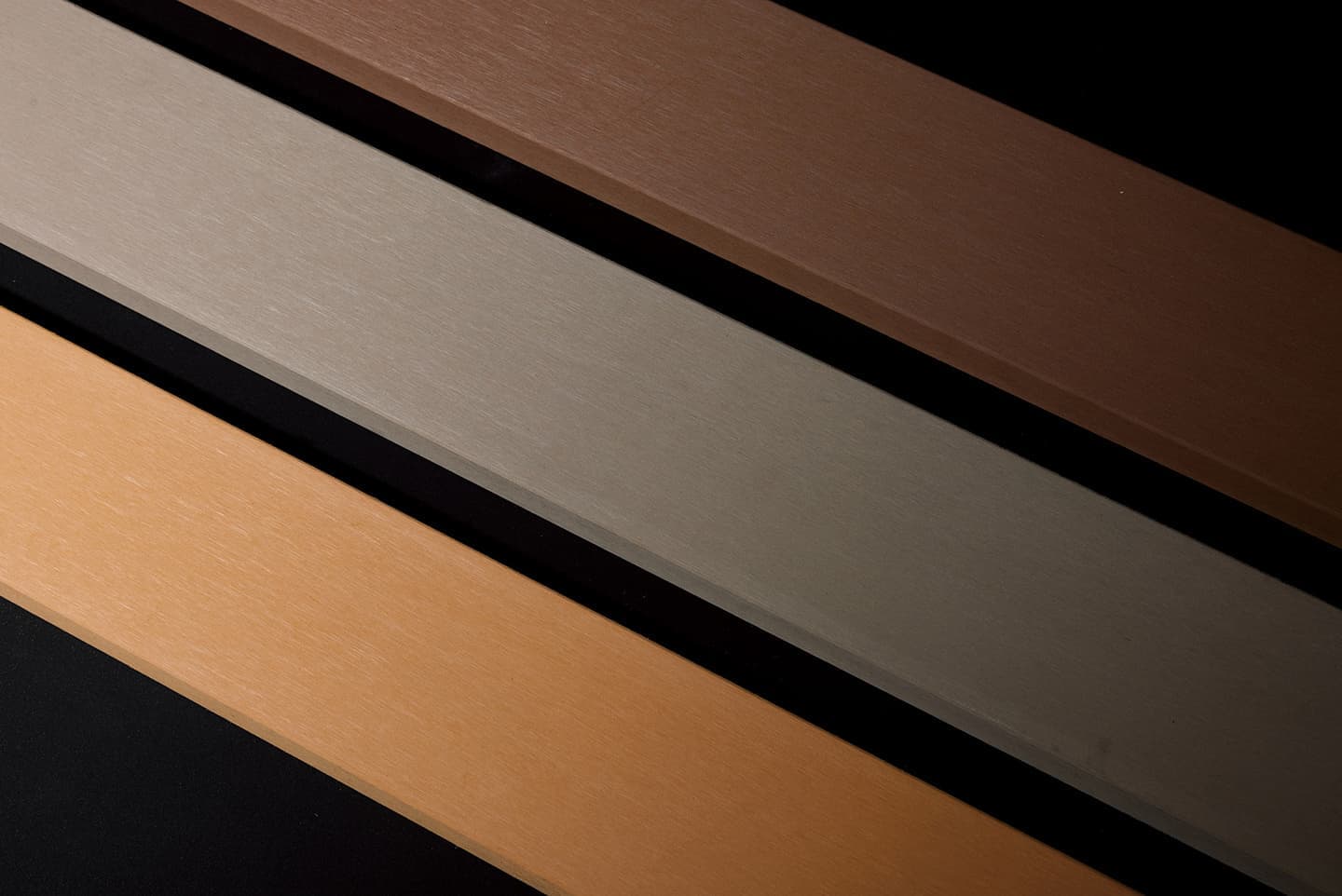 ライトブラウン・ダークブラウン・グレーの木材に、ダスティー・ビビッド・モノの3種類のトーンのアルミフレームをアクセントカラーとして加えることで、洒脱な空間から落ち着いた世界まで、環境やシチュエーションにあわせた自由な風景づくりが可能です。