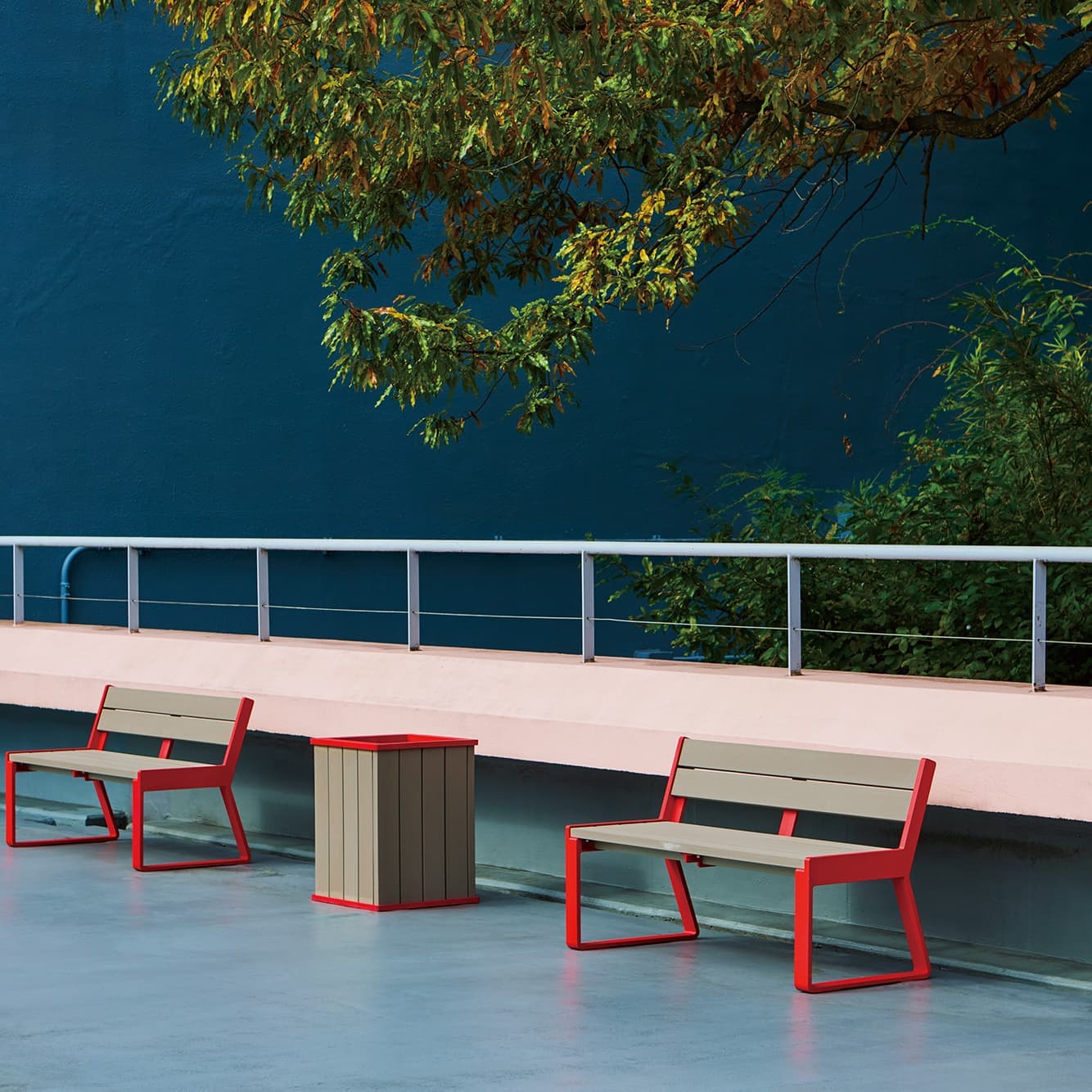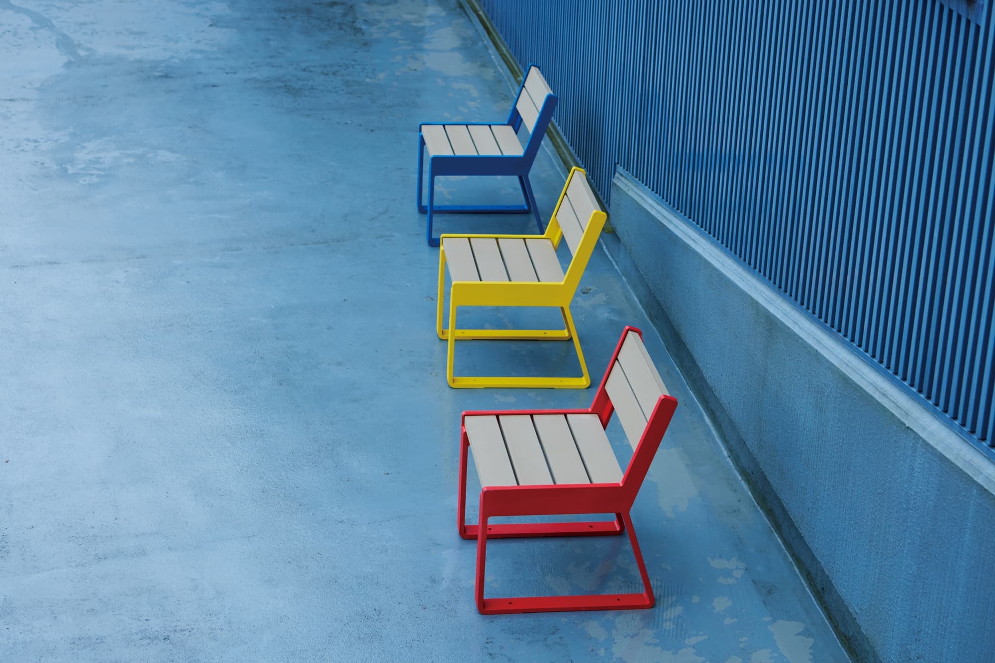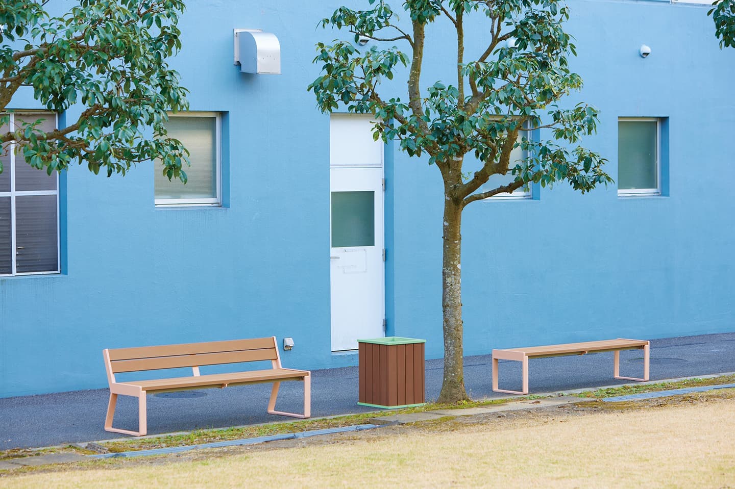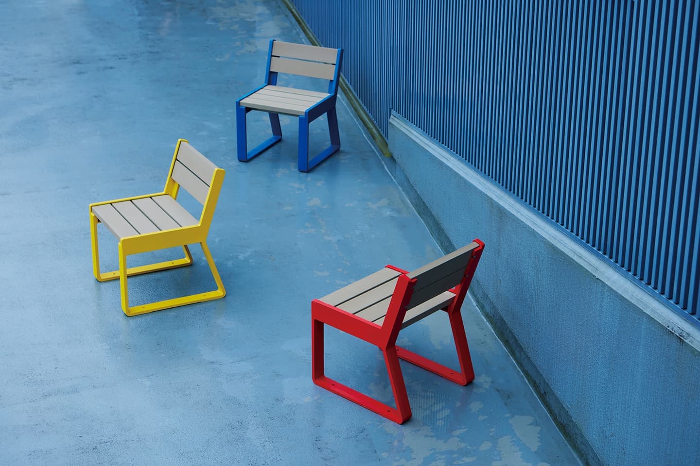 ノイラウムの製品は全て、過剰な装飾を排除し、機能性を突き詰めたデザインで設計されています。3色の再生木材と9色のアルミニウム製フレームの組み合わせによって、まちを豊かに彩ります。