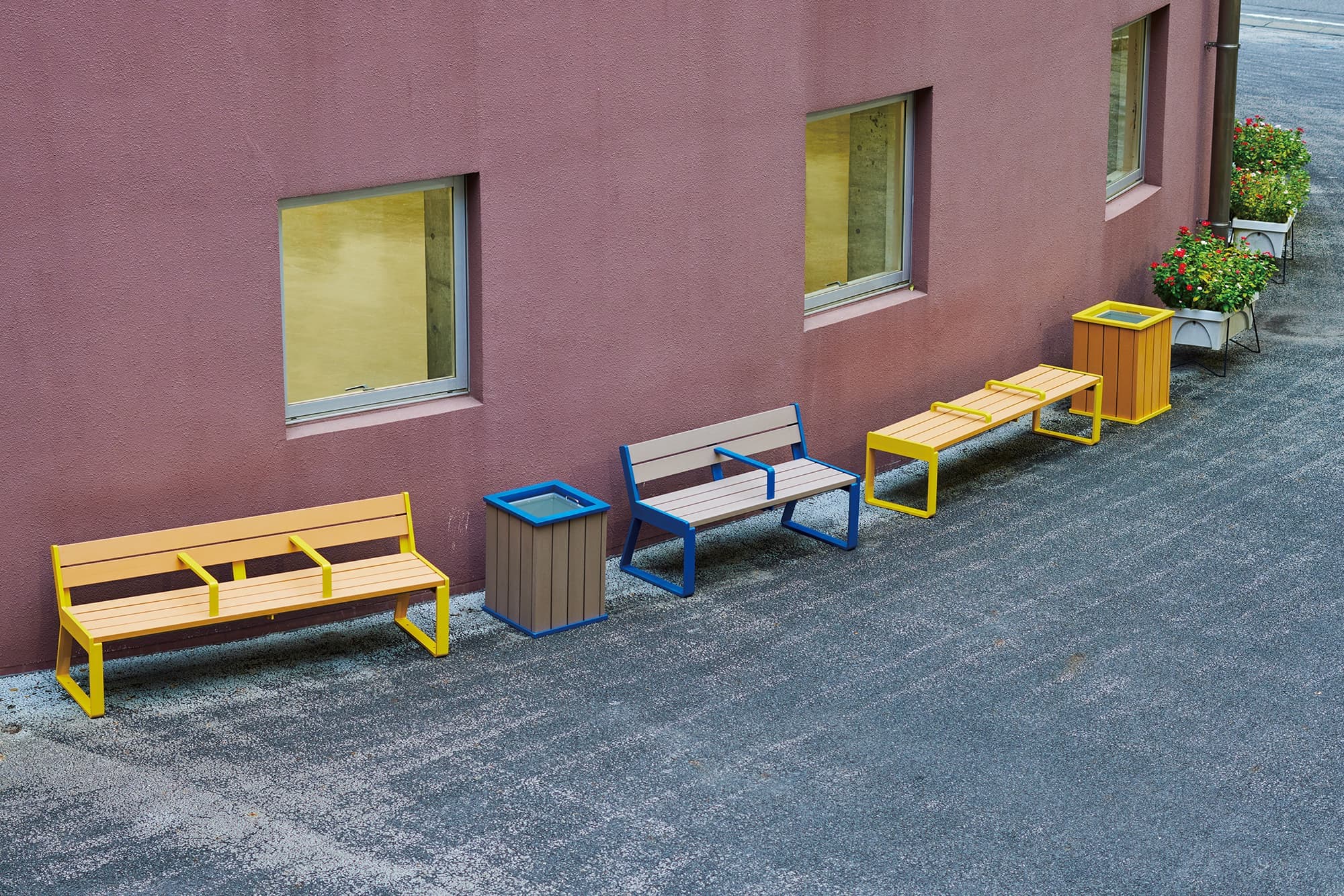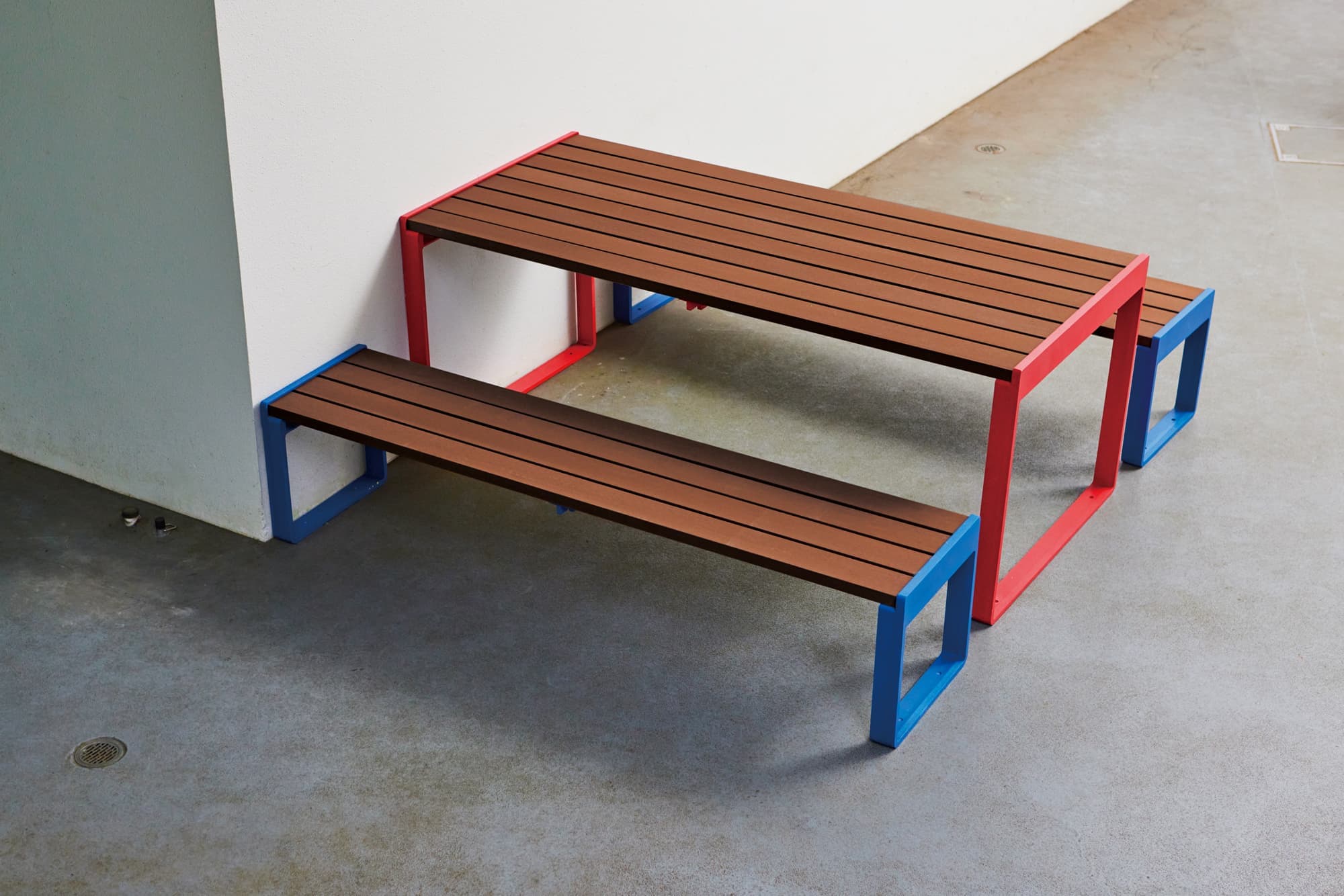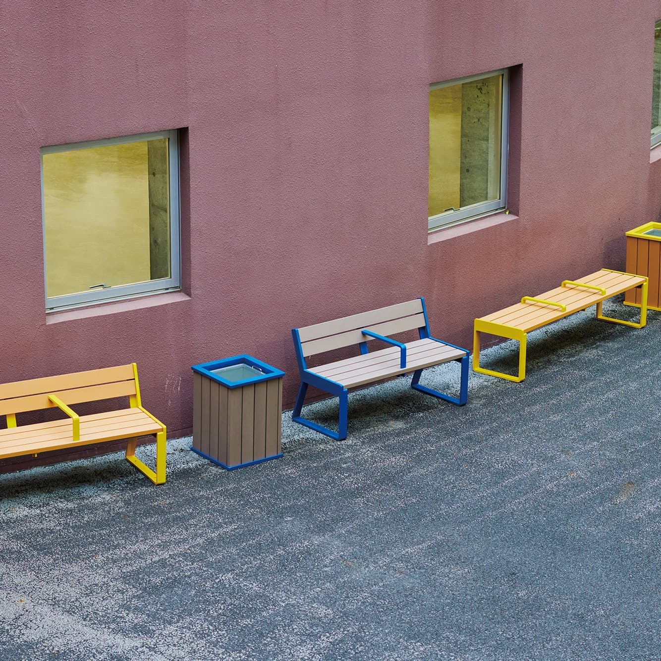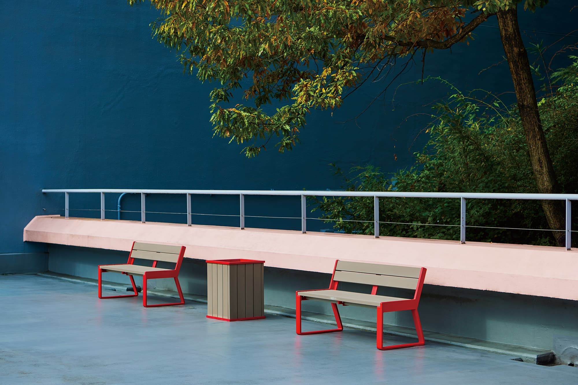 ノイラウムの製品は全て、過剰な装飾を排除し、機能性を突き詰めたデザインで設計されています。3色の再生木材と9色のアルミニウム製フレームの組み合わせによって、まちを豊かに彩ります。